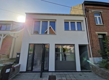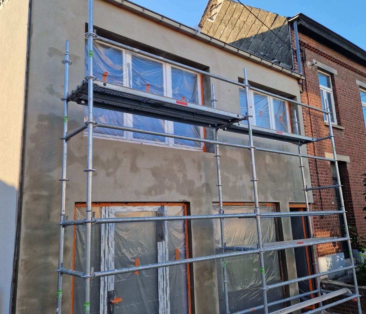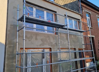 De gevel is hersteld met een geschikte bekleding en versterkte isolatie. Hij is nu klaar om geschilderd te worden, wat een aantrekkelijke en duurzame afwerking garandeert.