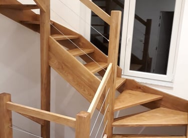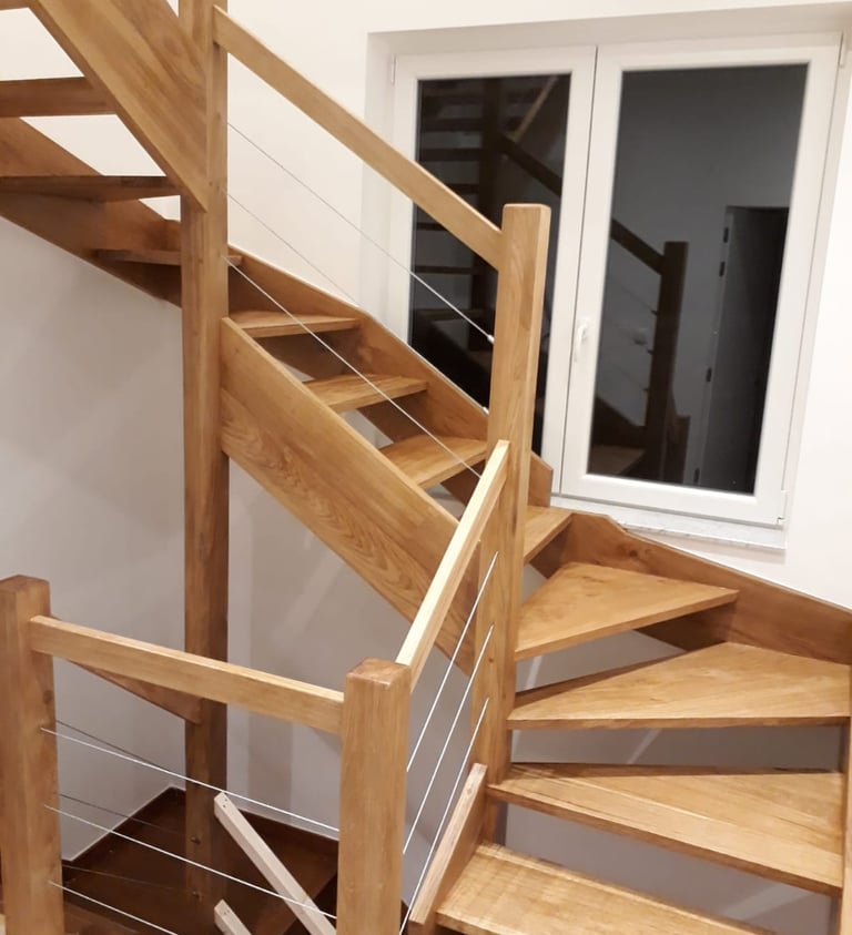 Deze trap combineert esthetiek en robuustheid dankzij het natuurlijke hout. Het tijdloze ontwerp voegt een warme, authentieke toets toe aan elk interieur.